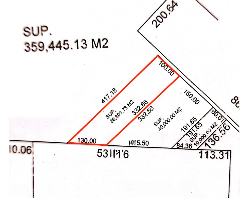 The property has a 100-meter frontage and depths of 417 meters on one side, 332 meters on another, and 130 meters at the rear, forming an irregular lot with excellent development potential.